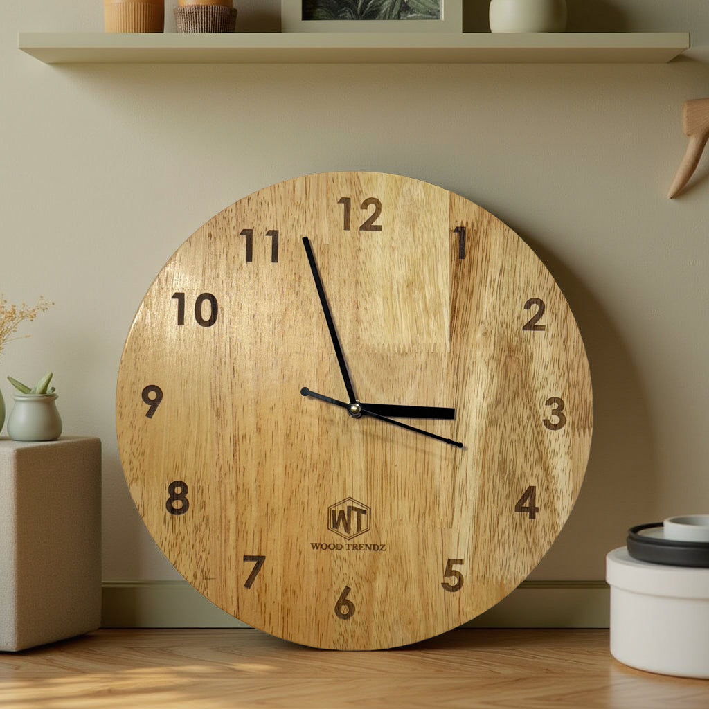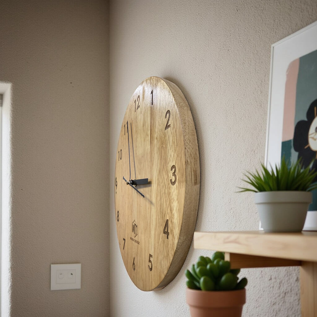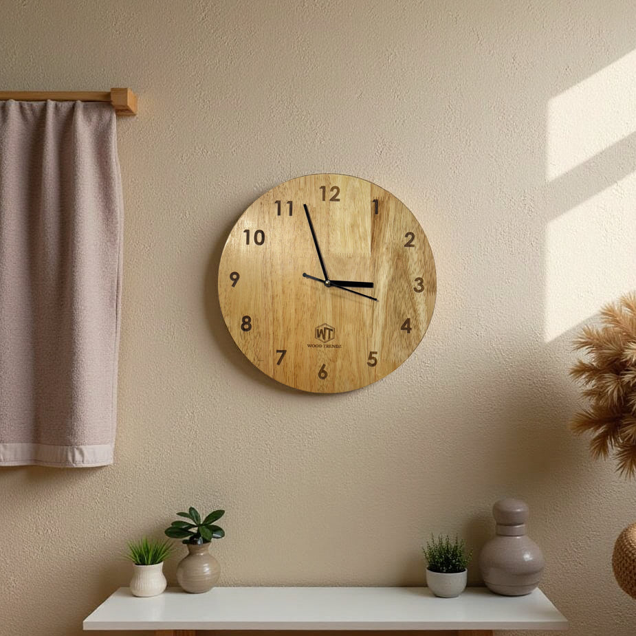 Enhance your space with this Round Wall Clock, crafted from solid rubberwood in a beautiful natural beige finish. With a diameter of 29.6 cm, this modern wooden wall clock blends minimalist aesthetics with eco-friendly sustainability.