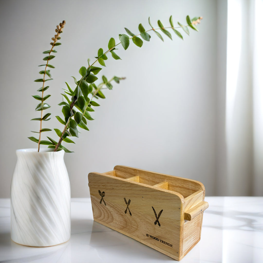 Wooden Cutlery Holder – 3-Compartment Solid Rubberwood Organizer